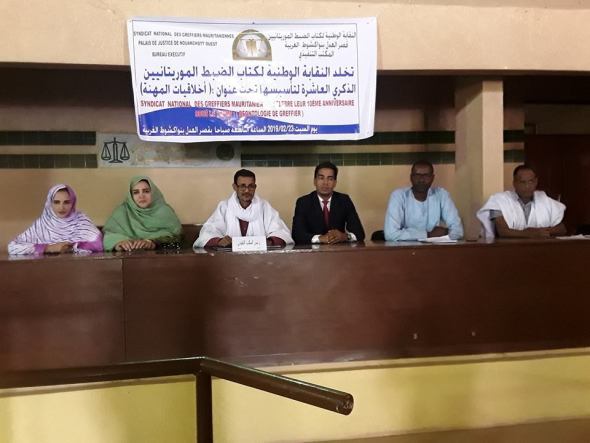 شهدت احدى القاعات بقصر العدل بانواكشوط الغربية ،صباح اليوم تظاهرة احتفالية مميزة نظمتها النقابة الوطنية لكتاب الضبط الموريتانيين بمناسبة الذكرى العاشرة لتأسيسها ، وقد حضر هذا الحفل عدد من كتاب الضبط ، وألقى رئيس النقابة الأستاذ : محمدن عالي كلمة شكر فيها الحضور ، وثمن دور الذي تلعبه هيئتهم التي تعتبر هي الوحيدة في هذا الاطار القانوني .