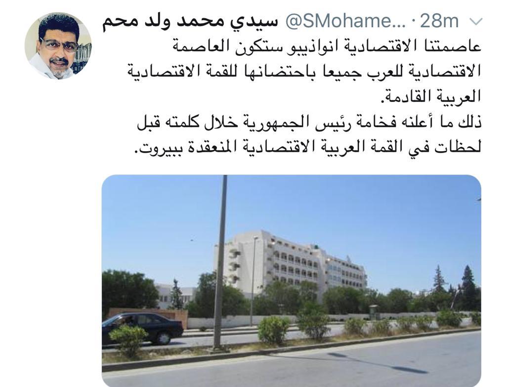 قال رئيس الجمهورية محمد ولد عبد العزيز خلال كلمة له في الجلسة الافتتاحية للقمة العربية الاقتصادية صباح اليوم في العاصمة اللبنانية بيروت إن القمة الاقتصادية العربية القادمة التي ستستضيفها موريتانيا ستنعقد أشغالها في العاصمة الاقتصادية نواذيبو شمال البلاد